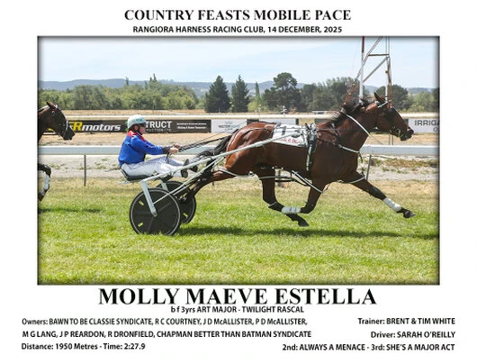Molly Maeve EstelleStable Name: Starts: 10Wins: 2Placings: 3Form: 801x938219x3Trainer: Brent and Tim WhiteStables: Ashburton RacewayNotes: 3rd Methven - 12th April 2026